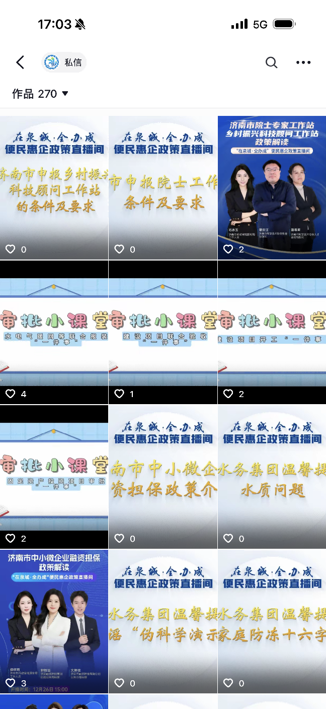 着力做好政务新媒体矩阵运维管理,微信公众号通过一图读懂、视频指南、问答解读等活泼生动、通俗易懂的形式,常态化发布惠企政策、便民举措、新闻热点、工作动态等内容,方便企业群众及时了解审批服务、改革创新信息动态。依托微信视频号、抖音号等短视频平台,做好“在泉城·全办成”便民惠企政策直播间运行工作,会同税务、商务等有关部门,实时互动宣讲“高效办成一件事”等政策要点,完善问题建议闭环流转机制,形成政企政民“双向互动”良好局面,全年组织开展企业数据填报“一件事”政策问题解答等直播40期,积累粉丝7.07万人。