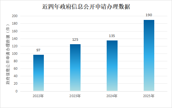 用足用好政府信息依申请公开办理系统,优化完善政府信息公开全流程办理机制,及时会商研究疑难件,做好沟通服务和问答指导,全力帮助申请人排忧解难。全年共受理政府信息公开申请190件,申请内容主要集中在项目建设等领域,依法依规办结190件。